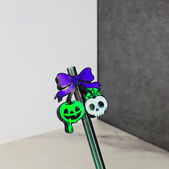 Sweet with a spooky twist, our Cherry-Inspired Skull and Jack-o'-Lantern Straw Topper is the perfect Halloween accessory for your tumbler! Designed like a pair of cherries, this fun 3D topper features a skull and jack-o'-lantern as the "fruits," connected by arched stems and tied together with a cute bow.
