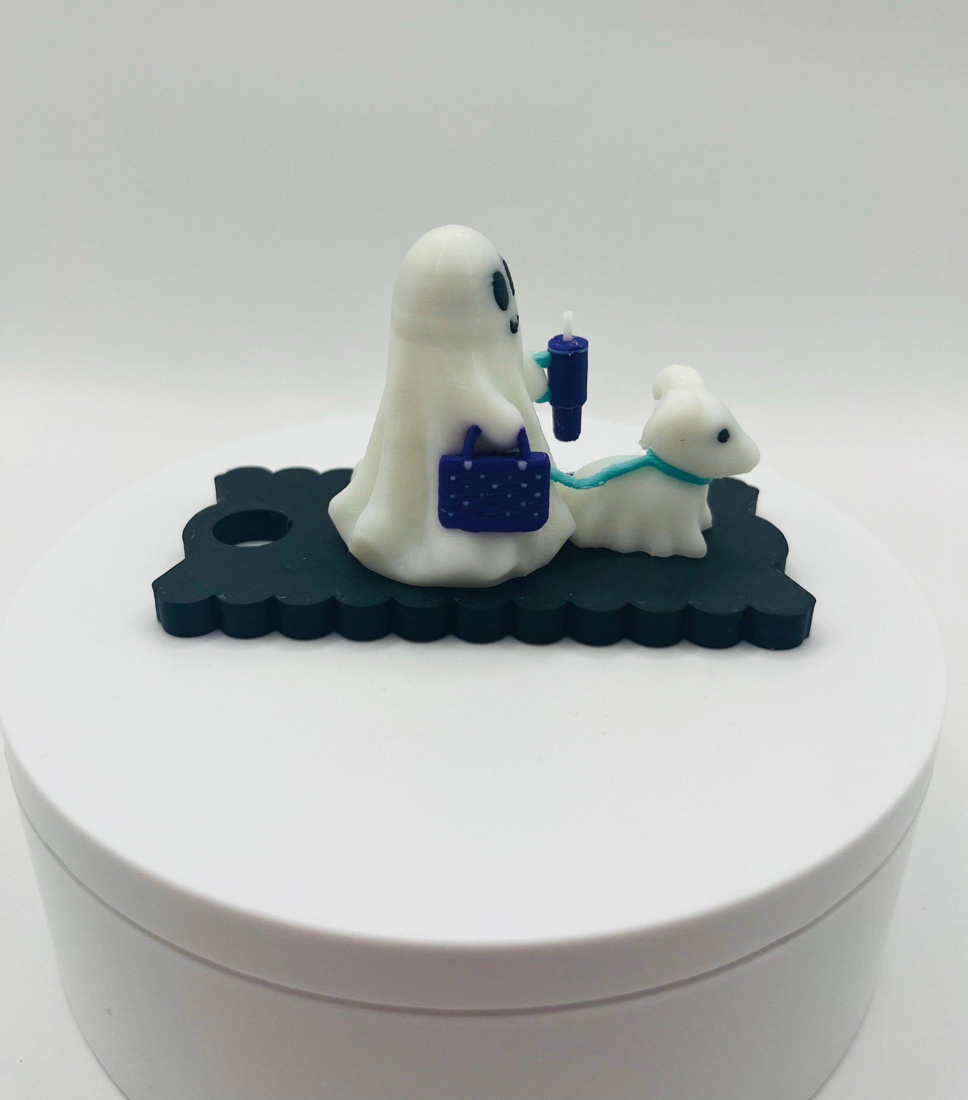 Elevate your Halloween spirit with our 3D Printed Ghost Walking Dog Lid Topper! This playful topper features a friendly ghost and a cute dog, with the ghost cleverly holding a tumbler and a matching Bogg bag. Perfectly designed for both 30oz and 40oz Stanley Tumblers, it adds a whimsical touch to your seasonal celebrations.