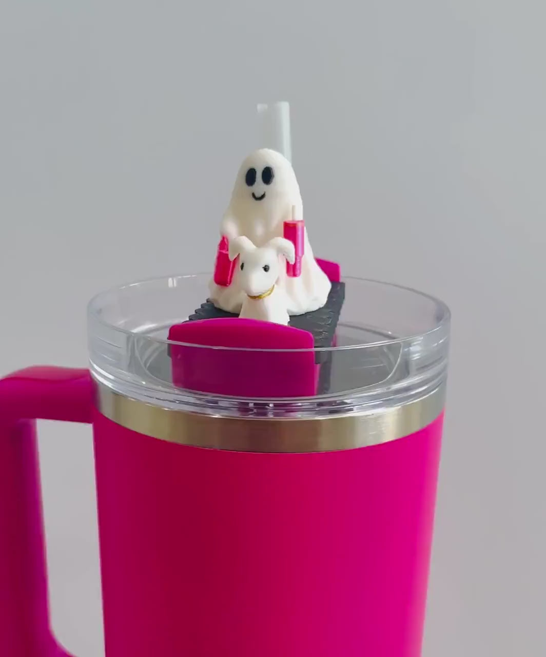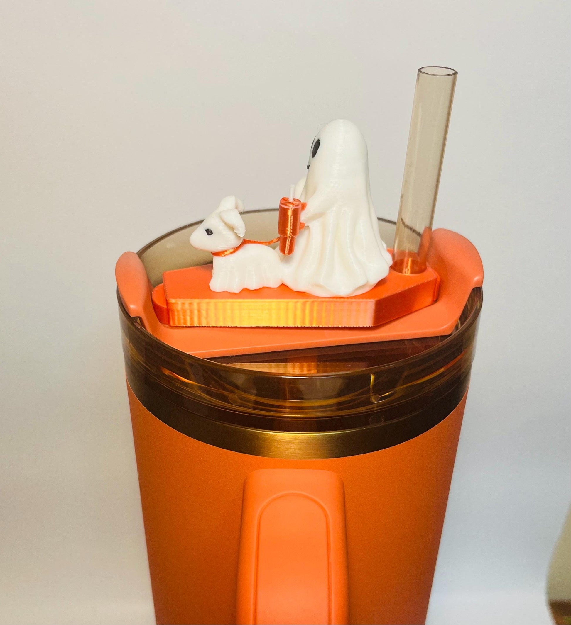 Elevate your Halloween spirit with our Glow In the Dark 3D Printed Ghost Walking Dog Lid Topper! This playful topper features a friendly ghost and a cute dog, with the ghost cleverly holding a tumbler and a matching Bogg bag. Perfectly designed for both 30oz and 40oz Stanley Tumblers, it adds a whimsical touch to your seasonal celebrations.