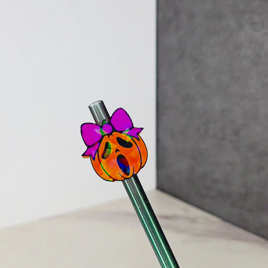 Bring the perfect blend of spooky and sweet to your tumbler with our Ghost Pumpkin with Bow Straw Topper! This unique 3D design features a pumpkin-shaped base with a classic face of a ghost, topped with a cute bow for extra charm. It's the ideal Halloween accessory for anyone who loves a little eerie with their adorable.