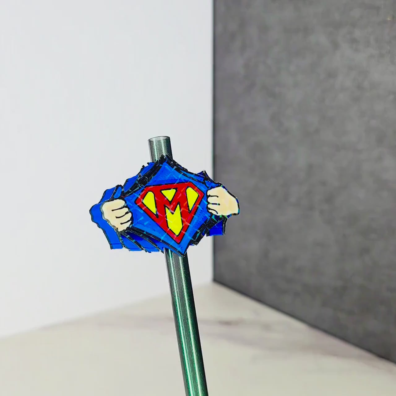 Unleash your inner hero with this **Hero Reveal Straw Topper**, featuring a bold, customizable letter peeking through a shirt-pull design. Inspired by iconic hero transformations, this topper is the perfect statement piece for your tumbler — fun, powerful, and uniquely yours.