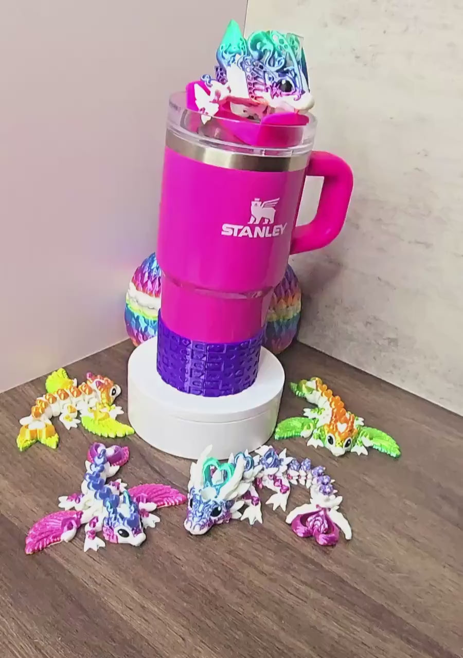 Add a touch of whimsy to your Stanley tumbler with these enchanting 3D printed dragon straw toppers! Featuring four delightful designs - the majestic *Alicorn*, the fluttering *Butterfly*, the adorable *Tiny Heart*, and the mysterious *Dark Heart* - each dragon is crafted with a fully flexible body that wraps around your straw for a fun, customizable look.