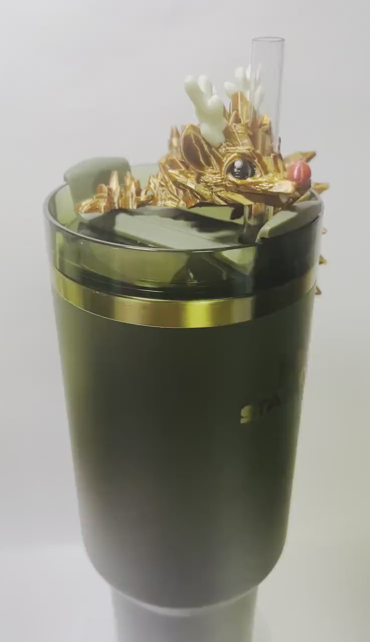 **Reindeer Winter Dragon Straw Topper for Stanley Tumblers - Festive 3D Printed Accessory**