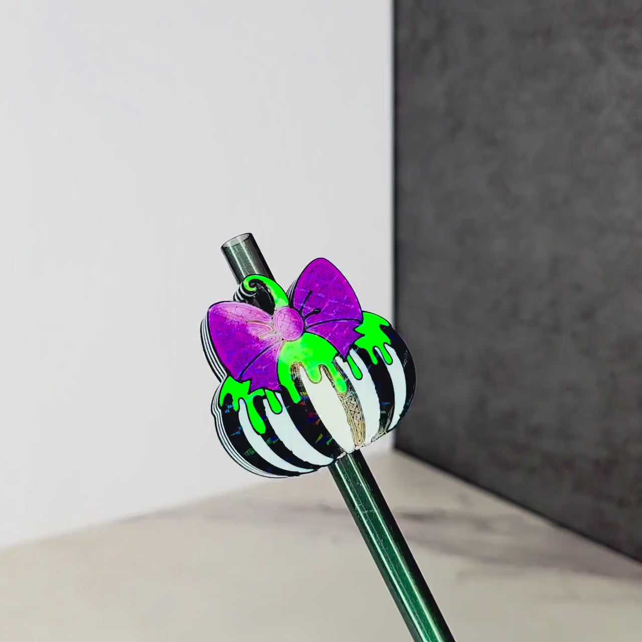 Add a dash of creepy-cute to your tumbler with our Spooky Cute Slime Pumpkin Straw Topper! This eye-catching 3D design features a black and white striped pumpkin topped with a bow — oozing vibrant slime for the perfect spooky-season aesthetic. It's the ideal accessory for lovers of gothic glam, pastel horror, or anything Halloween-inspired.